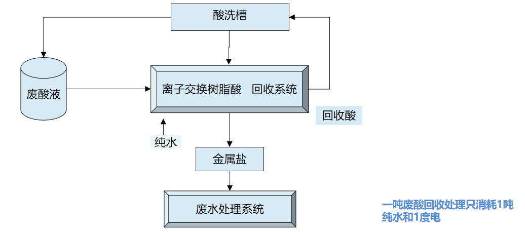 通過離子交換樹脂對廢酸中的離子進(jìn)行交換,從而實現(xiàn)酸的回收。離子交換樹脂具有選擇性吸附的特性,能夠吸附廢酸中的酸根離子,同時釋放出氫離子,從而實現(xiàn)酸的回收。具體過程如下: 吸附過程:廢酸溶液通過離子交換樹脂床時,樹脂上的氫離子與廢酸中的酸根離子發(fā)生交換反應(yīng),酸根離子被吸附在樹脂上,而氫離子則進(jìn)入溶液中,從而實現(xiàn)酸的回收。 再生過程:當(dāng)樹脂吸附飽和后,需要通過再生步驟將吸附的酸釋放出來。通常通過調(diào)節(jié)溶液的pH值或改變?nèi)芤旱碾x子濃度,使吸附的酸根離子從樹脂上解吸下來,并通過水洗過程將吸附的酸釋放出來,完成酸的回收。